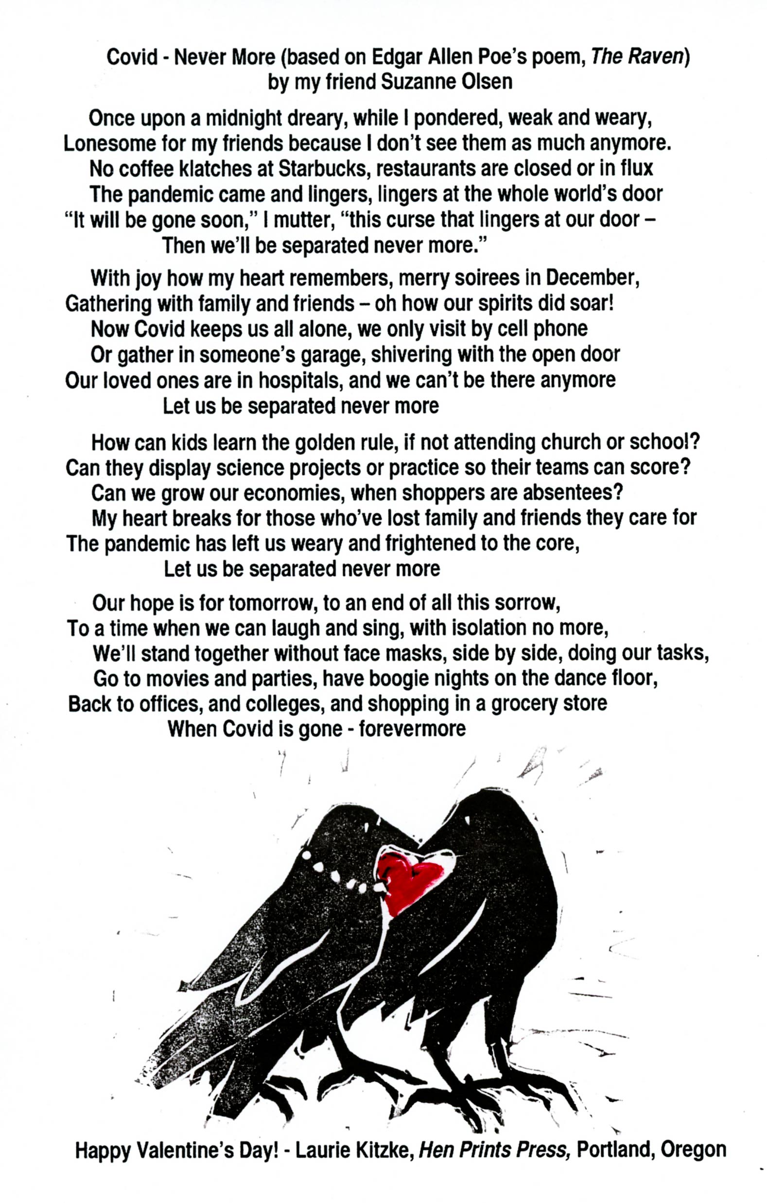 Every month Laurie does a printing project for her printers’ group’s “bundle.” February’s theme was Edgar Allan Poe. Over breakfast at Gators (they have outside seating) we worked on a poem based on Poe’s “The Raven” – you know, the one that says, “quoth the raven, ‘Nevermore.’” Laurie wanted the poem to be about Covid and how it’s keeping us away from our friends. I told her I’d write the poem using Poe’s rhyme scheme, which turned out to be one of those, “no good deed ever goes unpunished” kind of things. I see why Poe was famous – “The Raven” has a complicated, convoluted rhyme scheme, or, as Wikipedia puts it: The poem is made up of 18 stanzas of six lines each. Generally, the meter is trochaic octameter – eight trochaic feet per line, each foot having one stressed syllable followed by one unstressed syllable…The rhyme scheme is ABCBBB, or AA,B,CC,CB,B,B when accounting for internal rhyme.