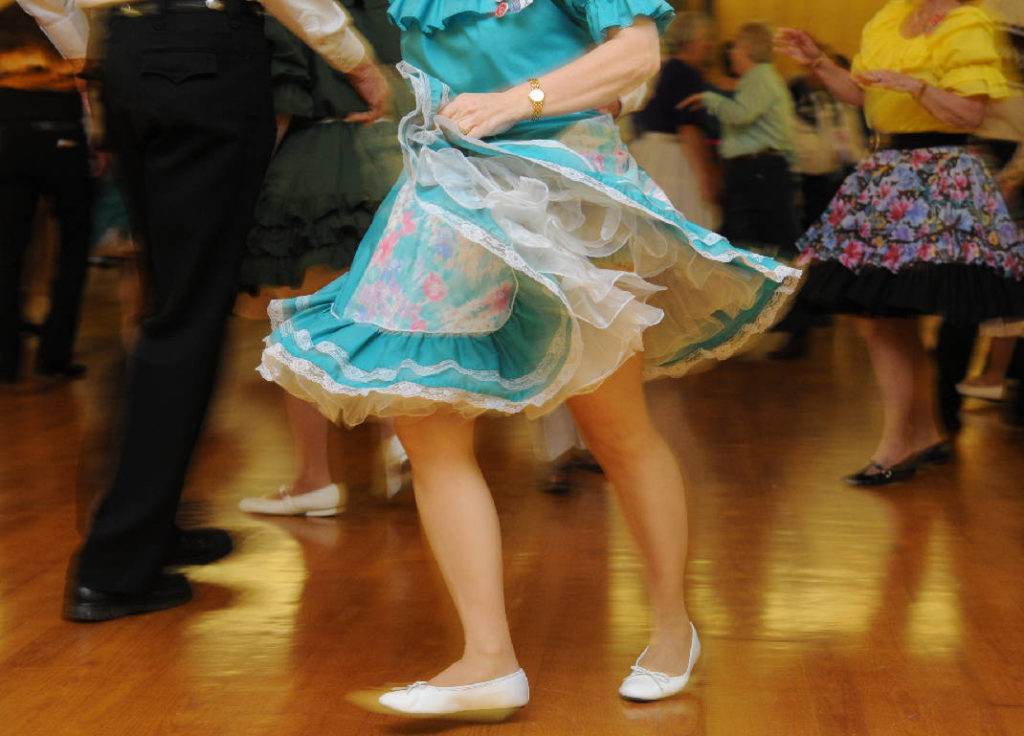 These callers were amazing. One rather large man in a black shirt tucked into black pants had a voice like thick chocolate syrup. Smooth and rich – a voice that could be deemed sexy in another circumstance but here it just sounded soothing. All of the callers sounded like professional radio announcers as they first walked us through the sequence of steps. Then they put on classic rock music and sang the calls. We all knew and loved the songs, delivered in those rich voices, the words being the steps we were supposed to make. One right after the other. Quickly changing partners. Being promenaded and twirled, showing off those big skirts and petticoats.